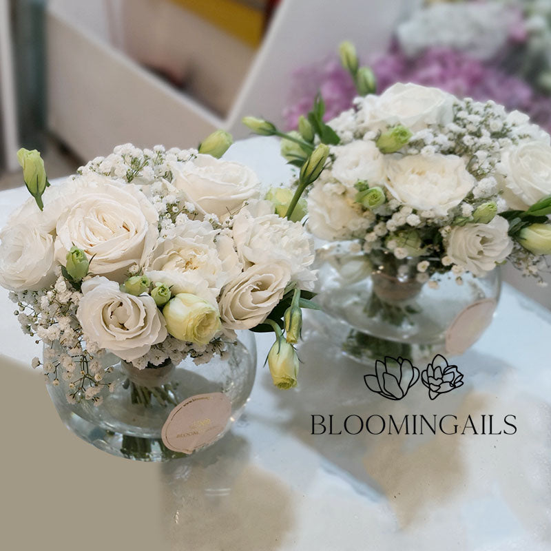 A duo of small fishbowl arrangements of white lisianthus, gypshophila and carnations. Great idea for coffee tables, altars, or console tables. Beautiful and pure only from the best flower shop in Manila that offers same day delivery.